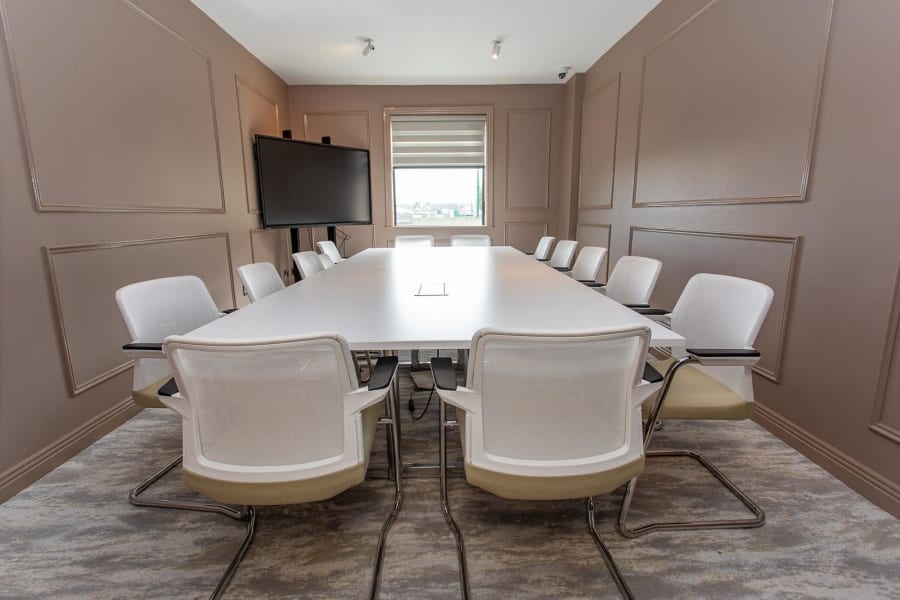 Size and Layout: The boardroom is rectangular, with a spacious layout that comfortably accommodates a large conference table in the center and can seat anywhere from 1 to 14 people,